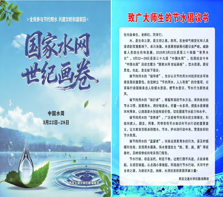 2026年3月22日是第三十四届“世界水日”,3月22—28日是第三十九届“中国水周”,我国本年“中国水周”勾当的从题为“国度水网 世纪画卷”。按照水利部工做摆设,凝结社会共识,让社会各方面领会水网扶植进展和成效,鞭策构成全社会支撑国度水网扶植的优良空气。为积极阐扬高校的榜样带头感化,3月22日—28日学校别离正在立异港、兴庆、雁塔、曲江四校区举办2026年“世界水日”“中国水周”宣传勾当并取得成功。